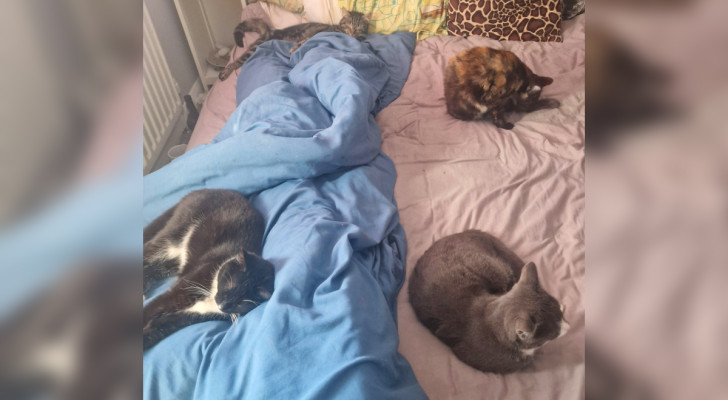 Donna entra nella sua stanza e vede quattro gatti dormire sul suo letto: c'è qualcosa di strano